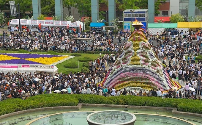 5月3日、2025ひろしまフラワーフェスティバルは、平和記念公園内の平和の灯から火が採火され、花の塔の頂上にともされました。 - 花の総合パレード